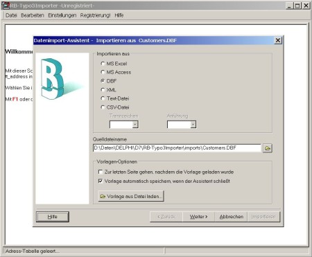 Komfortabel ASCII- und Dbase-Daten in die MySQL-Datenbank von Typo3 importieren. Der Import von anderen Formaten (z.B. Excel oder MS-Access) ist ebenfalls möglich.