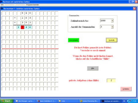 Das Übungsprogramm enthält "Rechenblätter" und "Arbeitsblätter" mit Aufgaben unterschiedlicher Schwierigkeitsgrade.
