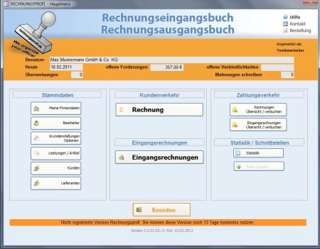 Rechnungseingangsbuch, Rechnungsausgangsbuch - einfach zu bedienendes Programm zum Erfassen von Eingangsrechnungen und Ausgangsrechnungen, Rechnungen - Software zur komfortablen Verwaltung von offenen Verbindlichkeiten, offenen Forderungen, permanenter Überblick über den Zahlungsverkehr, Liste bezahlte, offene Rechnungen.