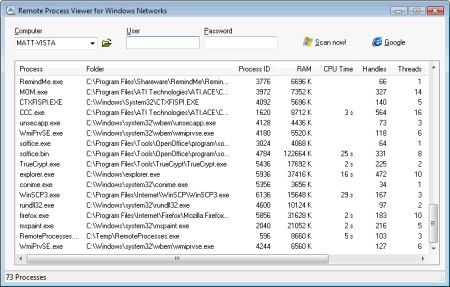 Dieser kostenlose Windows Task-Manager zeigt remote alle laufenden Prozesse auf einem beliebigen Computer im Netzwerk. Zu jedem Windows Prozess sehen Sie den Dateinamen, den vollständigen Dateipfad, RAM, CPU-Auslastung, PID (Prozess ID), Session ID (Benutzer), die Prozess Priorität uvm. Auf den den Computern im Netzwerk muss keine zusätzliche Agent Software installiert werden, da Remote Process Viewer den Windows WMI Dienst nutzt.