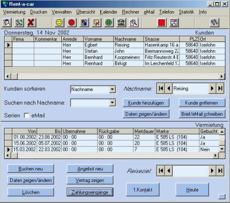 Rent-a-car ist einfach zu handhabendes Verwaltungsprogramm für Autovermietung mit sehr intuitver Benutzeroberfläche. Folgende Daten können verwaltet werden: Fahrzeugstammdaten, Kundenstammdaten, Tarifdaten, Mietvertragsdaten, Zahlungsabwicklungen, Mietverträge, Rechnungen, Auswertungen, Statistiken.