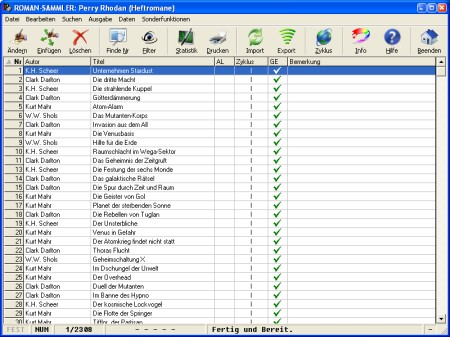 Der Roman-Sammler ist ein Programm zur komfortablen Verwaltung diverser Heftromane (Taschenbücher, Bücher, Comics). Speziell optimiert wurde der Sammler für die Perry Rhodan Serie. Für diese werden Datenbanken der Hefte bis 2050 und die komplette Taschenbuchliste mitgeliefert. * Zyklusinformationen und ausführliche Statistiken * Flexibler Im/Export * Umfangreiche Druck- und Filterfunktionen * Titelbildanzeige, Verknüpfung/Suche auf PR Archiv CD *