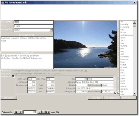 Leistungsfähige und sehr leicht bedienbare Foto Datenbank und Webseite für Fotografen, inkl. Suchsystem, Leistungsverzeichnis, etc. Keine montalichen Gebühren (Hosting Ihrer eigenen Domain ausgenommen). u.a MS Access ab Vers. 2000 erford., Auslieferung der Vollversion mit lizenz. MS Access Runtime