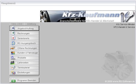 Funktionelle Software KFZ-Werkstatt und -Handel. Funktionen: Rechnung, Lieferschein, Angebot, Auftrag, Mahnung, Serienbrief, Kundenverwaltung (inkl. Kennz., Fahrgestell, Marke, Modell, HU, zu2, zu3, Inspektion), Artikel-Leistung-Materialstamm, Bestandsverwaltung, Rechnungsausgangsbuch, Bestellfunktion, Lieferantenstamm, Listendruck ,