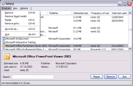Safarp listet alle installieren Programme von Windows auf und per Mausklick kann man einzelne davon schnell deinstallieren. Die in der Systemsteuerung enthaltene Funktion zum deinstallieren ist gerade bei vielen Programmen sehr träge. Safarp dagegen listet die Programme in Sekundenbruchteilen auf.