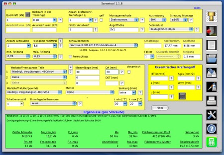Das Schraubenberechnungsprogramm Screwtool ist einfach und schnell zu bedienen. Die benötigte Schraubengröße wird iterativ berechnet. Es gibt Assistenten für querkraftbelastete Mehrschraubenverbindungen und für axial und exzentrisch belastete Mehrschraubenverbindungen. Verschiedene Montagemethoden werden unterstützt. Über 20 Schrauben-, 6 Mutternormen, 7 Unterlegscheibennormen sind integriert. Integration von Stiften oder Passschrauben möglich.
