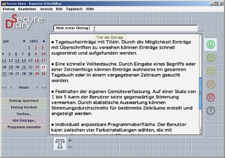 Mit Secure Diary führen Sie ein passwortgeschütztes Tagebuch, das Ihnen ein Leben lang erhalten bleibt. Neben der einfachen Bedienung wird das Programm von Anwendern ebenso aufgrund seiner Funktionsvielfalt und der individuellen Anpassbarkeit geschätzt. Zu den Funktionen zählen: Erfassung von Text und Bildern, Stimmungsskala, HTML/PDF-Export, Eintragstitel, schnelle Volltextsuche, Backup-Funktion, Mehrbenutzer-Fähigkeit, Biorhythmus-Anzeige uvm.