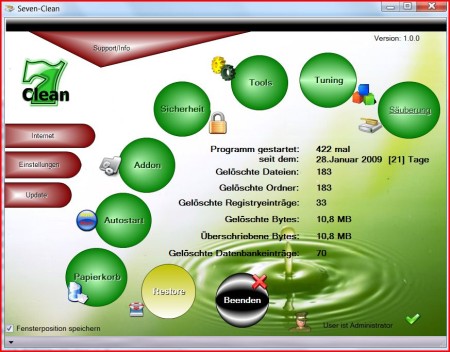 Seven-Clean Speed beinhaltet viele Funktionen zur Bereinigung des Systems und zahlreiche Einstellungsmöglichkeiten. Das Programm ist übersichtlich in neun Bereiche gegliedert: Internetspuren, Windowsspuren, Sicherheit, Netzwerk, Spyware,Dateien, Sonstiges und Optionen. Innerhalb der Bereiche stehen verschiedene Funktionen zur Auswahl. So können z.B. Cookies, Verlauf oder Temp-Dateien gelöscht und die Registry nach fehlerhaften Einträgen geprüft und bereinigt werden. u.s.w