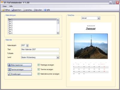 SF-FixFotokalender erstellt auf einfach und schnelle Weise 30 verschieden Fotokalender mit Ihren eigenen Bildern und Terminen. Die Bedienung ist schnell und einfach und das Ergebniss ist professionell. Die Feiertage, Kalenderwochen und Ihre eigenen Termine können integriert werden.