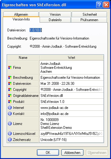 Diese Shell-Erweiterung zeigt die Versions-Information zu Programmdateien in einer zusätzlichen Explorer-Eigenschaftsseite an • Stellt eine alternative Implementierung mit einheitlichem Verhalten auf Systemen von Windows 95 bis Vista bereit • Unter Vista enthält die Eigenschaftsseite "Details" nicht mehr alle verfügbaren Datenfelder aber ShExVersion ermöglicht auch unter Vista den Zugriff auf die vollständigen Versions-Daten der Programmdateien