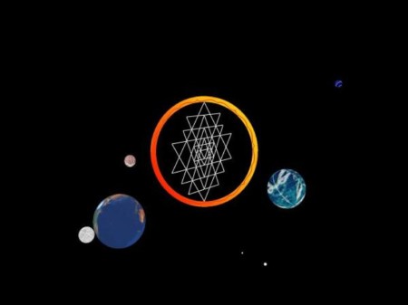 Rotierendes Shri Yantra mit umlaufenden Planeten unseres Sonnensystemes. Das in der Mitte angezeigte Bild kann einfach mittels Drag & Drop ausgetauscht werden. Die Animation wirkt sehr beruhigend, bei entsprechend eingestellter Geschwindigkeit.