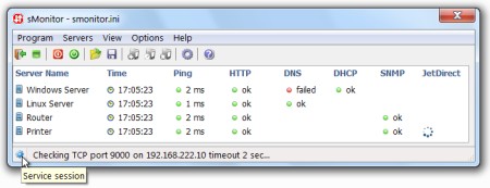 sMonitor ist ein Server-Uptime Monitor, der ständig den Online-Status von lokalen und Remote-Servern über das TCP / IP-Protokoll überwacht . Es bietet ein gründliches Reporting-System einschließlich der Fähigkeit, Dateien in Text-und HTML-Format speichern und automatisch auf einen FTP-Server zu übertragen. Es bietet auch SMS / E-Mail-Benachrichtigungen und alles andere, dass Netzwerk-Administratoren brauchen.