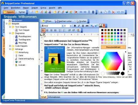 SnippetCenter ist das Tor zu Ihrem Wissen. Der Informations-Manager verwaltet und speichert Texte, PDFs, Diagramme, Dateien, Internetadressen, Kommentare und Anmerkungen übersichtlich innerhalb einer frei wählbaren Baumstruktur. Durchsuchen Sie Ihr Wissensarchiv mittels Volltextsuche. Die Bedienung erfolgt intuitiv und ohne Lernaufwand. Das Extra für Programmierer und Webdesigner: Codesnippets mit farbiger Syntaxhervorhebung in über 30 Sprachen!