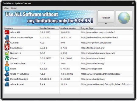 Soft4Boost Update Checker findet und installiert die neuesten Updates für Programme auf Ihrem PC. Soft4Boost Update Checker scannt den Computer nach installierter Software, überprüfen die Versionen und zeigt dann fein säuberlich und mit Download-Link alle neueren Versionen auf.