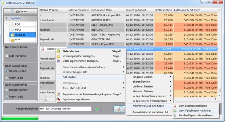 SoftChronizer kann zuverlässig nach jeder Art von doppelten Dateien in so vielen Verzeichnissen, wie Sie angegeben haben, suchen. Das Programm benutzt dafür entweder die äußerst genaue "Byte-für-Byte"-Suche, oder die sehr schnelle "Fuzzy-Logic"-Suchoption, die neben anderen Features, erstmalig in einem Duplikate-Suchprogramm, den raffinierten- und konfigurierbaren "Levenshtein-Distanz"-Algorithmus verwendet, um doppelte Dateinamen aufzuspüren.