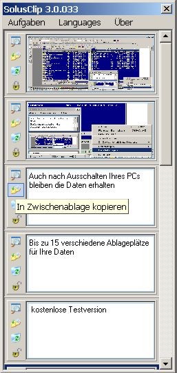 Solus Clip überwacht alle Bewegungen innerhalb der Zwischenablage. Dabei speichert Solus Clip die 15 letzten Inhalte der Zwischenablage, die zur Nutzung jederzeit wieder hergestellt werden können.