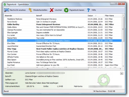 Spamihilator ist ein Programm, das Ihre Emails beim Herunterladen vom Server untersucht und unerwünschte Werbenachrichten herausfiltern kann.Das Programm schaltet sich zwischen Ihre Email-Software und das Internet. Jedes Mal, wenn Sie Emails empfangen, werden diese vorher von Spamihilator überprüft. Überflüssige Werbenachrichten werden herausgefiltert. Die Filterung läuft dabei vollständig im Hintergrund ab.