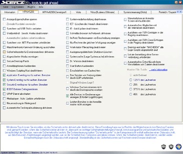 Die Software kann eine vollständige Analyse Ihres Systems durchführen und hilft Ihnen systemweite Einschränken zu setzen oder aufzuheben. Über 150 Funktionen können verändert werden - per Mausklick, nicht durch langwieriges Editieren der Registry oder das Editieren von Policies. Vor der Änderung kann das Tool Wiederherstellungspunkte erstellen. Weiterhin werden alle Ihre Vista Systemordner zugänglich gemacht.