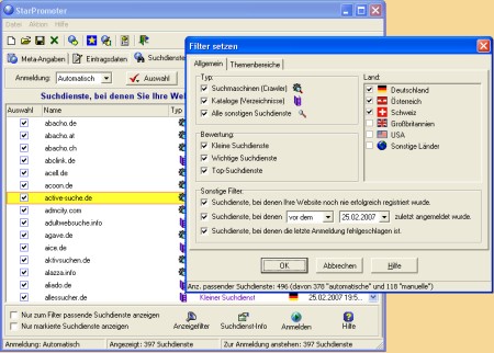 Software für die professionelle Anmeldung Ihrer Website bei allen wichtigen Suchmaschinen und Verzeichnissen. Das Programm unterstützt praktisch alle deutschsprachigen Suchdienste, die es gibt, sowie die wichtigsten internationalen Suchdienste. Tragen Sie Ihre Website per Mausklick, von Ihrem PC aus, bei Hunderten von Suchmaschinen ein! Das Programm enthält nur ausgewählte, hochwertige Suchdienste - keine wertlosen FFA-Linklisten!