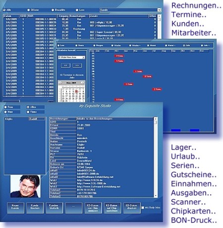 Studio4all6 ist ein modernes und bedienerfreundliches Studio- bzw. Praxis Software-Programm. Auch Nagelstudios, Kosmetikstudios, Haarstudios, Friseur-Salons, Fittnesscenter und Wellnesscenter mit mehreren tausend Mitgliedern können dank neuester Datenbankzugriffstechnik problemlos verwaltet werden. Serienbriefe, Kassenabrechnung, Lagerverwaltung, Kundenverwaltung, Mitarbeiterverwaltung u.s.w.