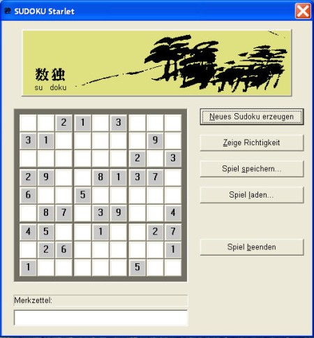 Erzeugung von Sudokus in 40 verschiedenen Schwierigkeitsgraden. Eigene Sudoku-Muster sind möglich. Richtigkeitsanzeige. Merkzettel für eventuelle richtige Zahlen. Speichern und Laden von Speilständen.