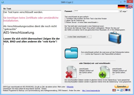 Mit SWX-Crypt ist es auf einfache Art und Weise möglich Texte und Dateien zu verschlüsseln und zu entschlüsseln. Es reicht, eine Datei per Drag ’n Drop auf das Symbol für die Verschlüsselung zu ziehen und schon wird die Datei verschlüsselt. Sichern Sie Ihre eMails jetzt ganz einfach. Schreiben Sie wie gewohnt Ihre Nachricht, klicken Sie auf "Text verschlüsseln" und ziehen Sie die Nachricht in Ihr eMailprogramm.