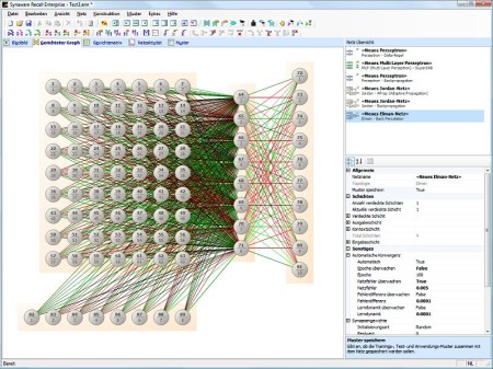 Entwicklungsplattform für den Entwurf und die Simulation von Neuronalen Netzen. Mit wenigen Handgriffen lassen sich Neuronale Netze konstruieren, welche sich sowohl innerhalb von Synaware Recall als auch in Ihren eigenen Programmen einsetzen lassen. Der Erstellungsprozess von Neuronalen Netzen besteht in der Regel aus Experimenten nach dem Prinzip "Try and error", was mit Synaware Recall optimal und zeitsparend realisiert werden kann.