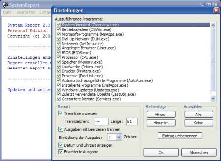 SystemReport ermittelt Informationen über die Hardware, das Betriebssystem und die installierte Software. SystemReport besteht aus einzelnen Konsolenprogrammen, die auch einzeln ausgeführt werden können. Mit Batch-Dateien können die einzelnen Programme auch hintereinander und individuell anpassbar ausgeführt werden. Der Umgang mit den Konsolenprogrammen wird durch die enthaltene Benutzeroberfläche vereinfacht.