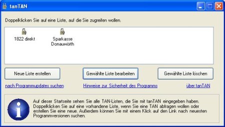 Mit dem Programm tanTAN kann man mehrere TAN-Listen mit bis zu 48bit verschlüsselt auf dem PC speichern. Beim Online-Banking hat man dann ohne lange Suche nach der richtigen TAN-Liste schnell die benötigte Transaktionsnummer zu Hand.