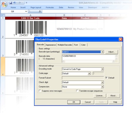 Erzeugen und drucken Sie mehr als 100 lineare und 2D Barcodes mit diesem Barcode ActiveX Control. TBarCode ist ein Multi-Barcode Generator für Office (Word, Excel, Access, InfoPath, ..) und Programmiersprachen (ASP/ASPX, .NET, VB.NET, CSharp, C, CPP,Delphi, ..) mit Druck und Image-Export (BMP, JPG, TIF, EPS, EMF, GIF). Erzeugt perfekte Strichcodes wie Code39, Code128, UPC, EAN, 2of5, PDF417, Data Matrix, QR Code, Semacode, GS1, DataBar, Aztec, ..