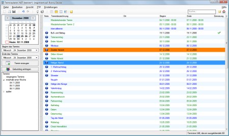 Der Terminplaner .Net ist eine kostenlose, speicherschonende Lösung zur Terminverwaltung. Im Gegensatz zu vielen seiner Konkurrenten beschränkt sich der Terminplaner .Net nur auf die wesentlichen Funktionen der Terminverwaltung und bleibt damit übersichtlich und einfach zu bedienen. Durch den integrierten FTP Upload und Download ist auch die Synchronisation der Termine zwischen mehreren Rechnern möglich.