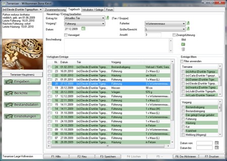 Mit dem Tagebuch als Hauptfunktion hast Du alle wichtigen Ereignisse Deiner Schützlinge im Überblick. Viele kleine Helfer werden Dich bei Deiner täglichen Arbeit mit Deinen Reptilien unterstützen.