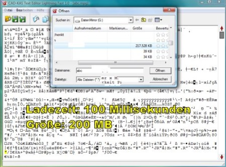 Ein kleiner, schneller Text Editor und Binärdateien Editor, um beliebige Dateien zu bearbeiten. Der Editor öffnet auch große Dateien (bis 2 GB) ohne Verzögerung. Die Datei wird nicht komplett in den Arbeitsspeicher geladen, sondern nur, das was Sie momentan auf dem Bildschirm sehen und alle Änderungen werden im Speicher gehalten. Sie können auch Binärdateien, also z.B. EXE oder PDF oder BMP Dateien laden, bearbeiten und speichern.
