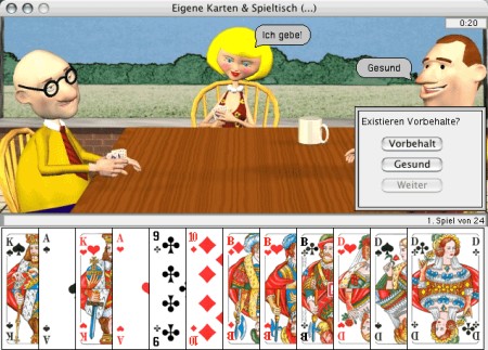 Tom`s Doppelkopf Express ist für den fortgeschrittenen Spieler gedacht. Seit der Entstehung von Doppelkopf haben sich eine Vielzahl von Spielvarianten entwickelt. Grundlage dieser Version sind die offiziellen Regeln des Deutschen Doppelkopf-Verbandes, erweitert um die gebräuchlichsten Varianten. Sie haben zur Auswahl: - 6 verschiedene Stimmen (3 Damen und 3 Herren) - 12 verschiedene Spielarten (Normal-, Expertmodus und Essener Ansagesystem);