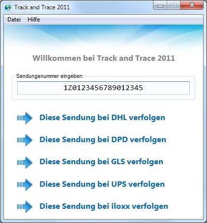 Track and Trace 2011 informiert Sie über den aktuellen Versandstatus Ihrer Paketsendung. Dabei ist die Bedienung von Track and Trace 2011 denkbar einfach. Geben Sie einfach die Paketnummer ein und wählen den entsprechenden Paketdienstleister aus, schon wird Ihnen das Ergebnis angezeigt. Mit Track and Trace 2011 können Sie Ihre Pakete von DHL, DPD, GLS, UPS und iloxx direkt am Desktop verfolgen.