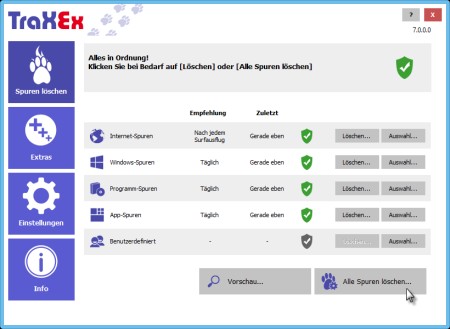 Sicherheit-Tool und Spurenverwischer für alle Internet-Browser (Internet Explorer, Firefox, Chrome Mozilla, Opera). Nach jedem Surfen verbleiben verräterische Spuren auf Ihrer Festplatte, die zudem unnötig Speichplatz belegen. TraXEx löscht zuverlässig alle Internet-Spuren, den Papierkorb, Temp-Ordner und Spuren von über 170 Programmen - mit einem Mausklick oder komplett automatisch. Kostenlose PlugIns für TraXEx gibt es im Internet.
