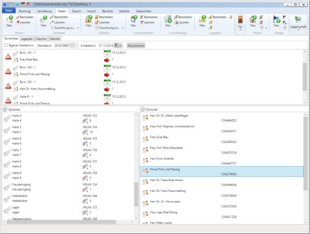 Mit TSObjektkey ist eine lückenlose Bestandsführung Ihres Schlüsselbestandes möglich. Sie können zu jedem Zeitpunkt den Verbleib eines Schlüssels überprüfen, können feststellen, wer welchen Schlüssel hat und vieles andere mehr. Die Schlüsselverwaltung ist sowohl in einer Einzelplatz als auch in der Mehrplatzversion verfügbar. Schlüssel können komfortabel in Schlüsselkasten verwaltet werden.Zu jedem Zylinder können Schlüssel zugeordnet werden.