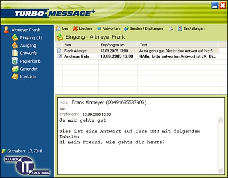 Turbomessage+ versendet und empfängt SMS über eine Standardinternetverbindung. Senden Sie eine SMS direkt von Ihrem PC, weltweit. Durch deutsch Direktrouting wird Ihre Nachricht innerhalb von wenigen Sekunden zugestellt. Versenden Sie eine SMS genauso einfach an mehrere Empfänger, inklusive persönlicher Anrede. Durch ein einfaches Prepaidsystem haben Sie die volle Kostenkontrolle.
