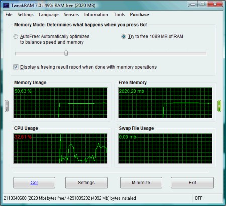 TweakRAM ist ein nützlicher Speicheroptimierer, der dafür sorgt, dass Ihr Computer schneller und effektiver arbeitet. Er erhöht die Leistung Ihres Systems durch Freisetzen von Speicher, der dann von Ihren Anwendungen oder Ihrem Betriebssystem genutzt werden kann.