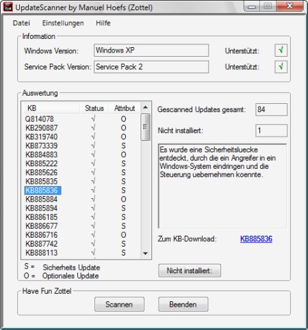 Mit dem UpdateScanner können Sie Ihr System nach bereits installierten Updates untersuchen. Fehlen Ihnen Updates, so werden Ihnen diese Aufgelistet! Somit kann ermittelt werden, ob Sie vielleicht noch wichtige Patche benötigen.