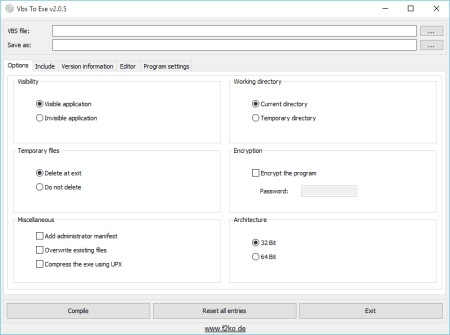 VbsToExe ist ein Kommandozeilentool, dass Vb-Scripte in Exe Dateien umwandelt. Der Quelltext des Scripts ist nach dem Vorgang nicht mehr einzusehen. Es wird keine temporäre Datei beim Ausführen erstellt. Das Script kann auch wieder entpackt und optional mit einem Passwort geschützt werden.