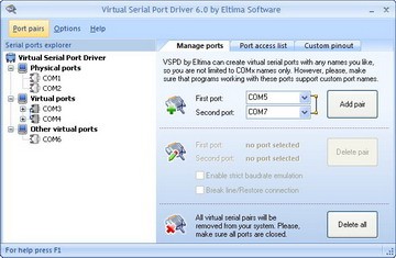 Virtual Serial Port Driver erzeugt auf dem PC Paare der virtuellen COM-Ports. Mithilfe dieser Ports können verschiedene serielle Anwendungen miteinander verbunden werden und per virtuelles Nullmodem-Kabel Daten übertragen. Die auf einen virtuellen COM-Port geschriebenen Daten können vom anderen sogleich gelesen werden.
