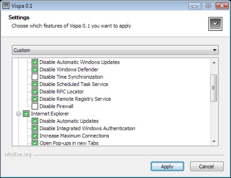 Vispa ermöglicht zum einen Geschwindigkeitsoptimierungen bei Windows Vista und Windows 7. Zum anderen kann es Funktionen von Vista deaktivieren, welche ungewollt Daten an Microsoft schickt oder schicken soll.