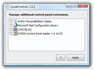 visualControls deaktiviert Einträge in der Systemsteuerung von Microsoft Windows, die von Programmen Dritter angelegt werden. Prominente Beispiele dafür sind AntiVir, Grafik- und Soundkartentreiber, Nero, Java, QuickTime und viele weitere. Alle Änderungen lassen sich jederzeit wieder rückgängig machen.