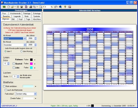 + Druckt vollautomatisch einseitige Kalenderblätter + Sofortige Druckvorschau in beliebiger Vergrößerung + Einfaches Setzen von Eigenschaften + Einer bis beliebig viele Monate auf dem Blatt + Laden und Speichern aller Einstellungen + Hintergrundbild und -färbung + Kopf- und Fußtext, Arbeitstagestatistik & Legende + Angabe von KW, jul.Datum, Feiertagsnamen, Mondphasen + Extratage wie z.B. Geburtstage + Bereichsmarkierung + u.v.m.