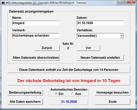 Der WDS-Geburtstagswächter erinnert Sie an den nächsten Geburtstag. Er bietet Platz für 100 Datensätze. Das Programm startet mit Windows und schließt sich dann nach kurzer Zeit. Zu jeder Person kann ein Hinweis und das Verhältnis eingegeben werden.