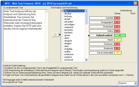 Ein optimierter Text fesselt den Leser, erhöht seine Aufmerksamkeit und motiviert ihn zu handeln. Mit WebTextEnhancer (WTE) können Sie Wirkung und Ausdruck von Texten in kürzester Zeit analysieren und optimieren. Fügen Sie wichtige Schlüsselwörter hinzu zu: Webseiten, Verkaufstexten, Inseraten - sogar Google Adwords Anzeigen.