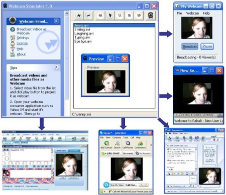 Simuliert das Vorhandensein einer Webcam, indem es eine virtuelle Kamera auf dem Rechner erstellt und über diese eigene frei wählbare Videodateien ausstrahlt, welche dann in das Internet übermittelt werden können. Es kann mit allem Instant Messenger wie MSN, Yahoo, AOL, ICQ verwendet werden.