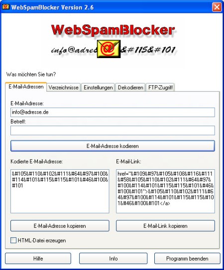 Der WebSpamBlocker tarnt Ihre E-Mail-Adressen so, dass diese von E-Mail-Spidern nicht mehr gelesen werden koennen. Dadurch wird das Problem, Spam zu bekommen, vermindert. Sie koennen ein Verzeichnis auswaehlen und der WebSpamBlocker arbeitet ganz von allein.