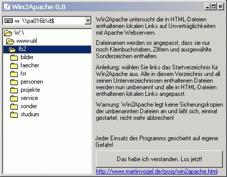 Ein One-Touch-Programm zur Anpassung von Windows-Dateinamen an die Erfordernisse eines Unix-Webservers. Mit Win2Apache ist die \"Reparatur\" einer kompletten Site eine Sache von ein paar Sekunden. Win2Apache durchsucht alle Dateien in allen Unterverzeichnissen, korrigiert alle Dateinamen und passt in allen HTML-Seiten die lokalen Links an.